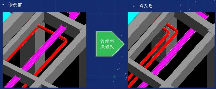 施工图设计阶段的BIM应用是各专业模型构建并进行优化设计的复杂过程。各专业信 息模型包括建筑、结构、给排水、暖通、电气等专业。在此基础上,根据专业设计、施工等 知识框架X,进行碰撞检测、三维管线综合、竖向净空优化等基本应用,完成对施工图阶 段设计的多次优化。针对某些会影响净高要求的重点部位,进行具体分析并讨论,优化机电 系统空间走向排布和净空高度。