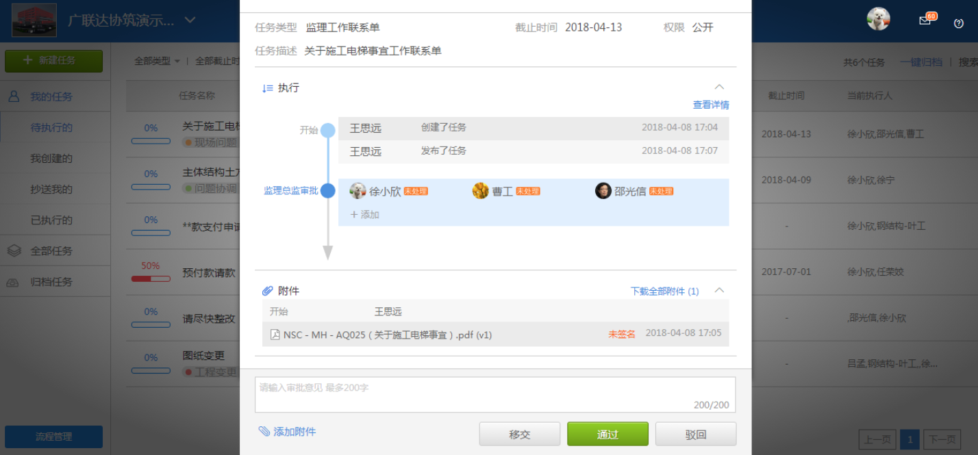11. 新增添加流程附件可直接通过协筑移动端扫描图纸、文件生成任务PDF,适用于创建流程时,把需要审核人电子签名的纸质文件扫描上传作为附件,无需再通过扫描仪,后续PDF扫描功能也会同步到上传文件。