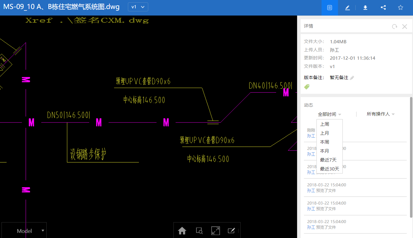 3. 新增单文件预览页中文件动态可以按时间、按操作人分类筛选的功能,通过该功能,可以快速地查找项目上某一成员是否下载或者预览了该文件,对于图纸分发的辅助管理很有价值,管理员可以方便地统计是否相关方都已经查阅了或者下载了该图纸,若是没有,可以通过@的功能,发私信给需要下载的人员,进行补充通知,保证所有的人员都已经下载了最新版本的图纸。